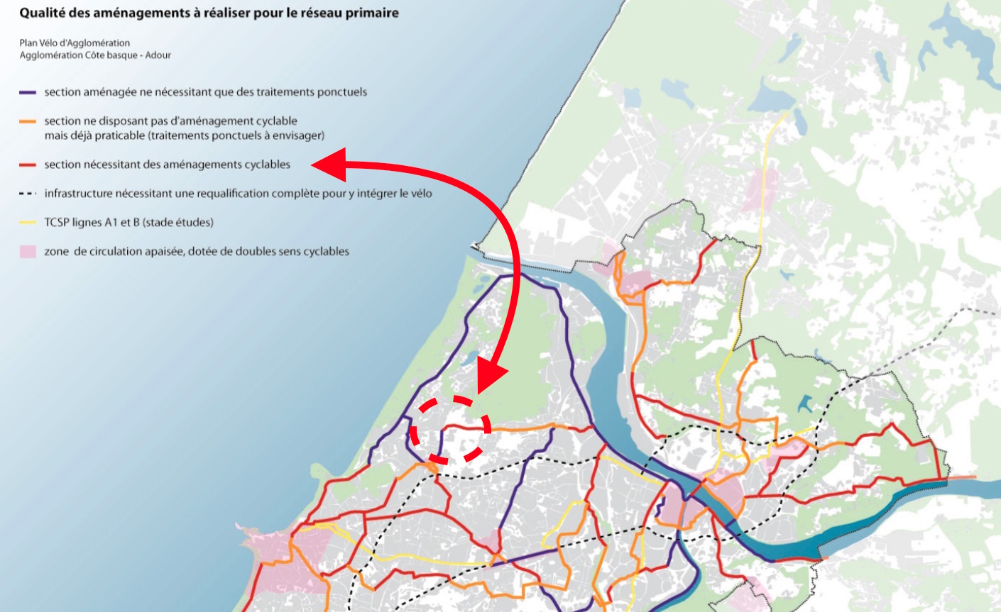 Sur cette carte de l’agglomération, les aménagements provisoires sont en rouge et concernent des sections du boulevard du BAB, du boulevard d'Aritxague et de la RD810. Cette dernière portion a déjà fait l'objet d'une